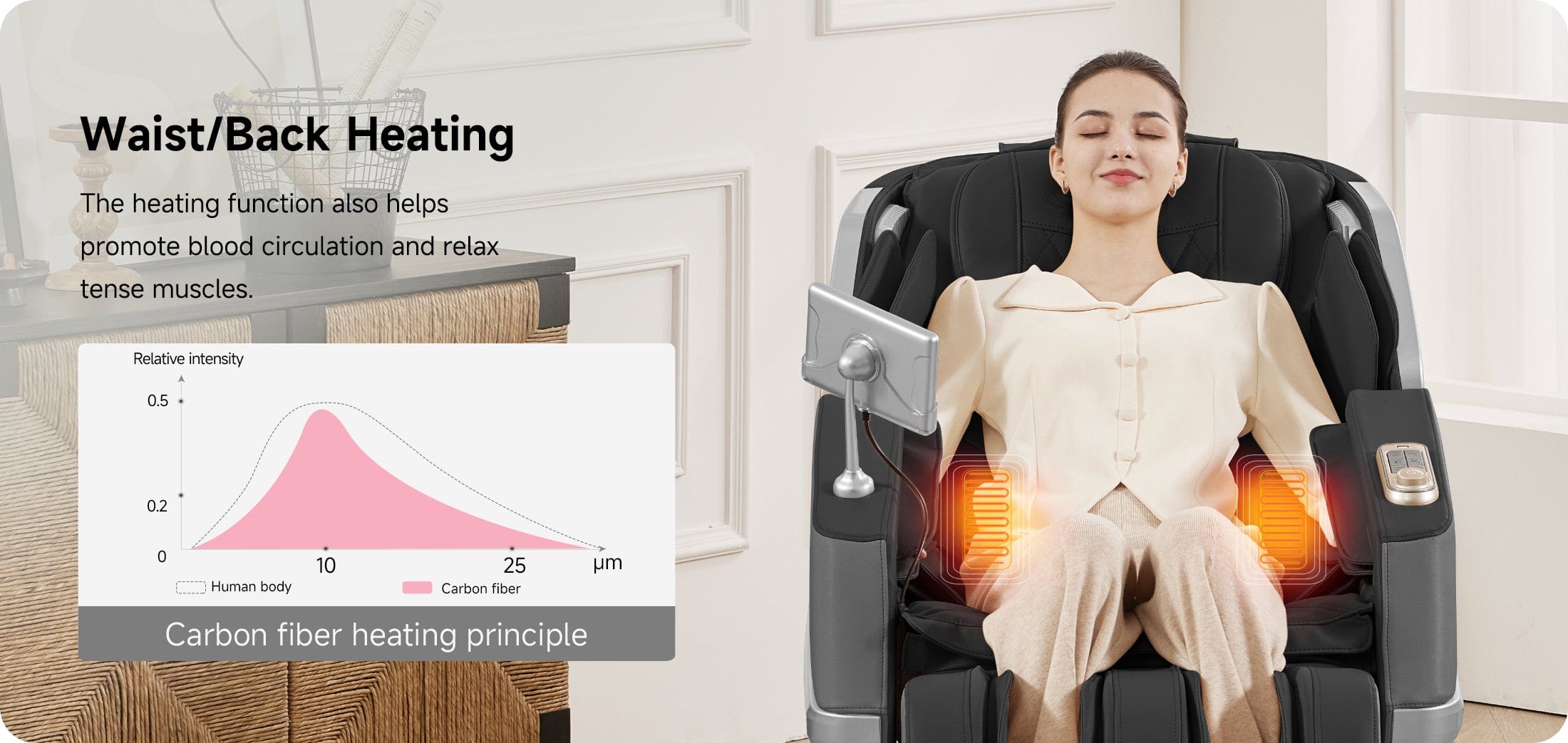 ergonomic design with the principles of zero-gravity and the comfort of a luxurious seat. By simulating the feeling of weightlessness, it allows users to experience a massage in a state of complete relaxation, free from external pressures.
