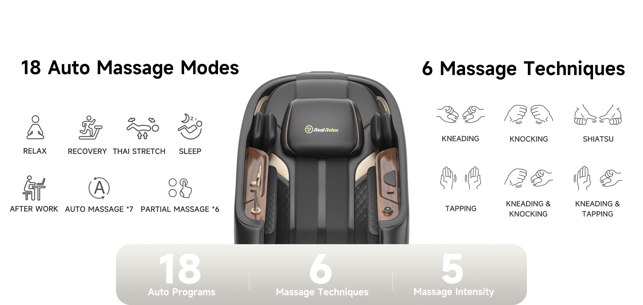 Equipped with the industry-leading 3D massage mechanism, Real Relax massage chair features the cutting-edge massage system that delivers a comprehensive and intelligent massage, easing the tension in your shoulders, spine, lumbar region, and gluteal muscles.